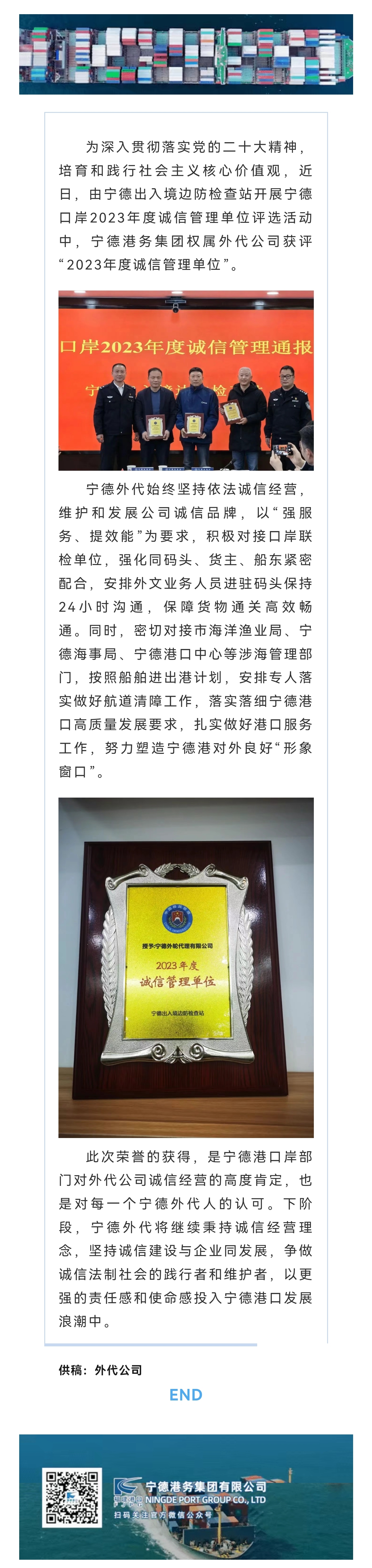 [喜报丨宁德港务权属外代公司获评2023年度诚信管理单位 - 51视频