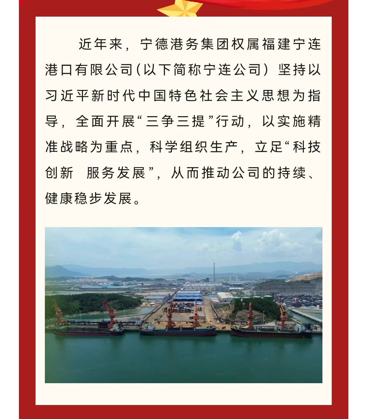 秉承“团结、爱港、务实、发展”的理念,全力推进漳湾作业区码头泊位连片开发,不断完善公司治理体系,深化体制机制改革,聚焦主责主业发展实体经济,推动产业转型升级,打造区域港口龙头企业,成为宁德市建设公共码头、助力工业及经济发展的平台及抓手,推动地方经济高质量发展超越。